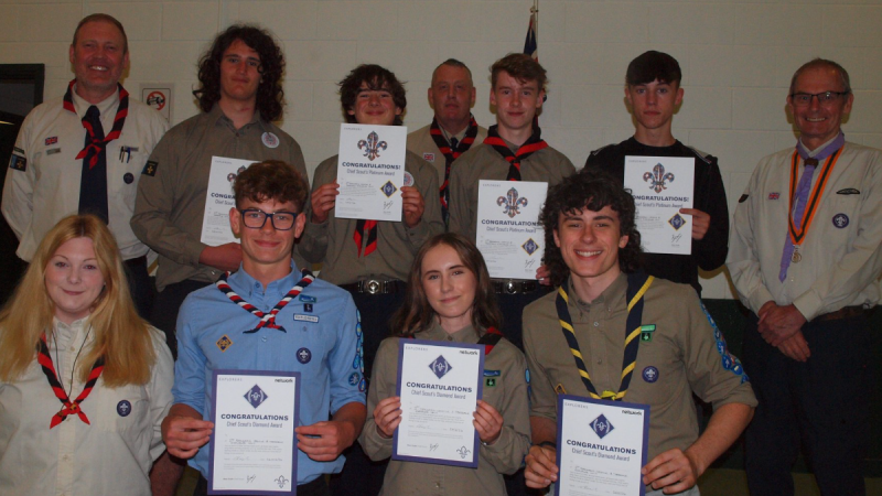 Lead Volunteer Bryan Johnson recently attended Barnard Castle Scout HQ to present several awards to members of Teesdale District. 3 Explorer Scouts were presented with the Chief Scout Diamond Award, whilst 4 were presented with the Chief Scout Platinum Award. Two sets of wood beads were also present to Dan & Leah, members of the team for Explorer Scouts Leadership Team.